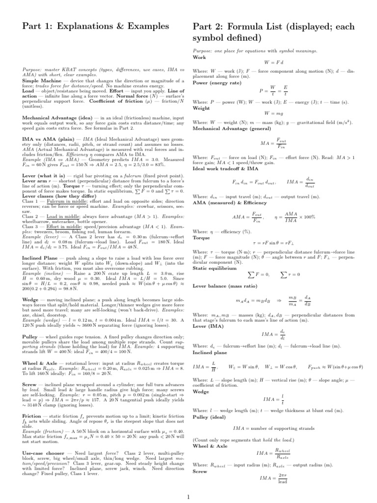 Purpose: master KBAT concepts (types, differences, use cases, IMA vs Where: W — work (J); F — force component along motion (N); d — dis-