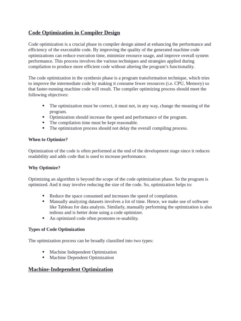 Code optimization is a crucial phase in compiler design aimed at enhancing the performance and