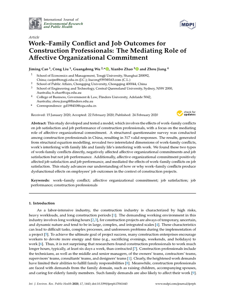 WFC may drive construction professionals’ job outcomes, such as job satisfaction and job performance.