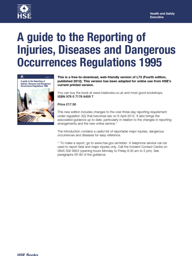 This is a free-to-download, web-friendly version of L73 (Fourth edition, published 2012). This version has been adapted for online use from HSEs current printed version. You can buy the book at www.hsebooks.co.uk and most good bookshops. ISBN 978 0 7176 6459 7 Price 17.50 This new edition includes changes to the over-three-day reporting requirement under regulation 3(2) that becomes law on 6 April 2012. It also brings the associated guidance up to date, particularly in relation to the changes in reporting arrangements and the new online service.* The introduction contains a useful list of reportable major injuries, dangerous occurrences and diseases for easy reference. * To make a report, go to www.hse.gov.uk/riddor. A telephone service can be used to report fatal and major injuries only. Call the Incident Contact Centre on 0845 300 9923 (opening hours Monday to Friday 8.30 am to 5 pm). See paragraphs 55-90 of the guidance.