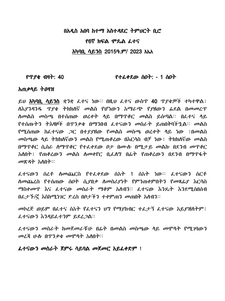 አ.አ ከተማ መስተዳድር ት/ቢሮ ሞዴል ፈተና 2015ዓ.ም አካባቢ ሳይንስ