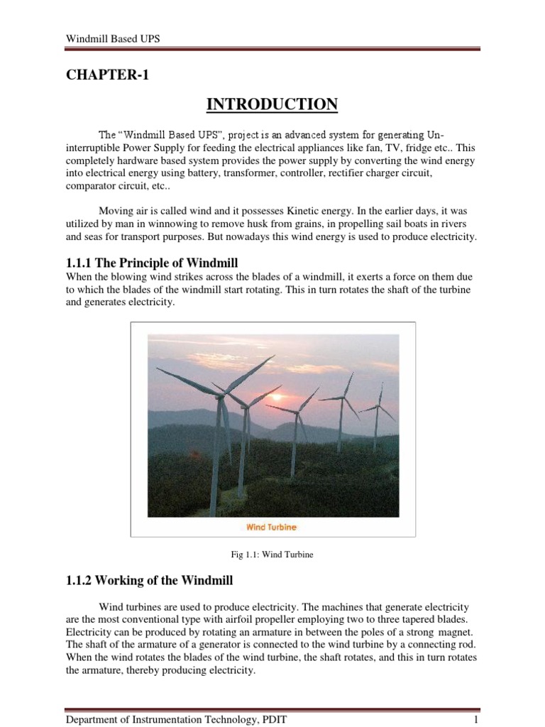 The Windmill Based UPS, project is an advanced system for generating Uninterruptible Power Supply for feeding the electrical appliances like fan, TV, fridge etc.. This completely hardware based system provides the power supply by converting the wind energy into electrical energy using battery, transformer, controller, rectifier charger circuit, comparator circuit, etc.. Moving air is called wind and it possesses Kinetic energy. In the earlier days, it was utilized by man in winnowing to remove husk from grains, in propelling sail boats in rivers and seas for transport purposes. But nowadays this wind energy is used to produce electricity.