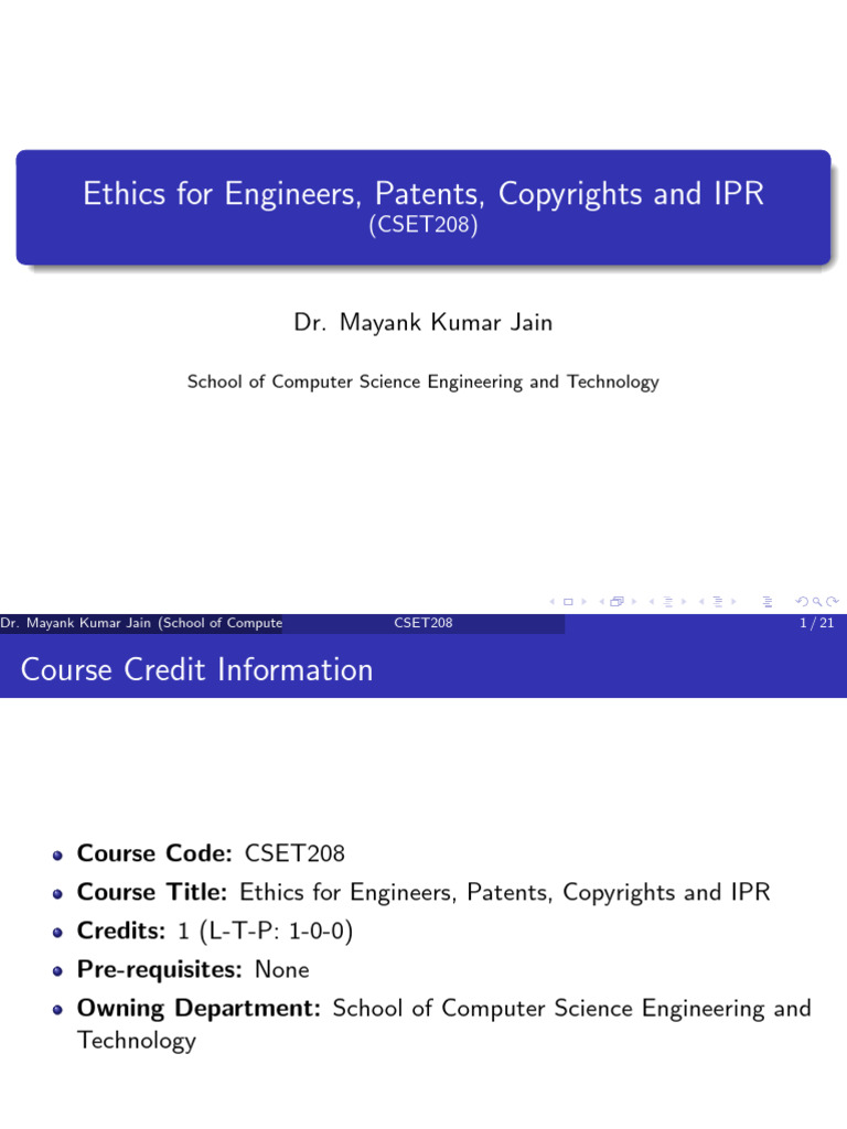 Course Title: Ethics for Engineers, Patents, Copyrights and IPR