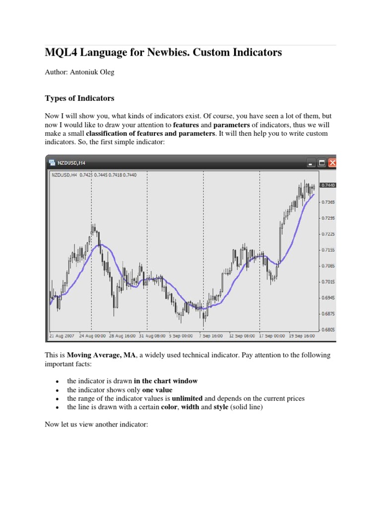 Now I will show you, what kinds of indicators exist. Of course, you have seen a lot of them, but now I would like to draw your attention to features and parameters of indicators, thus we will make a small classification of features and parameters. It will then help you to write custom indicators. So, the first simple indicator: