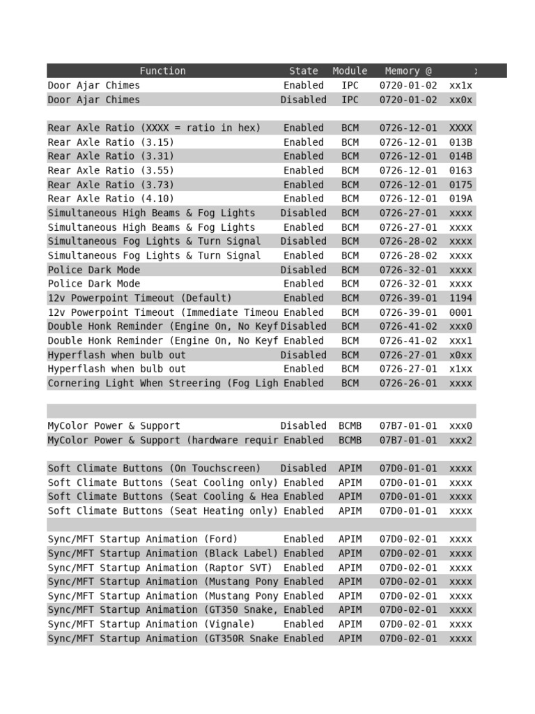 Rear Axle Ratio (XXXX = ratio in hex) Enabled BCM 0726-12-01 XXXX