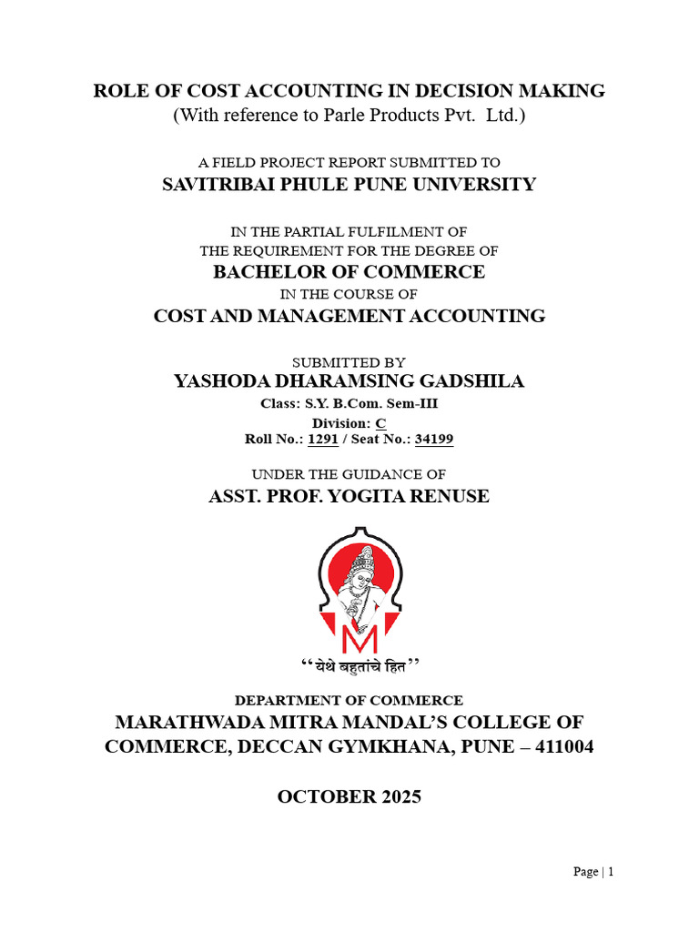 This is to certify that the project report entitled “Role of Cost Accounting in Decision Making