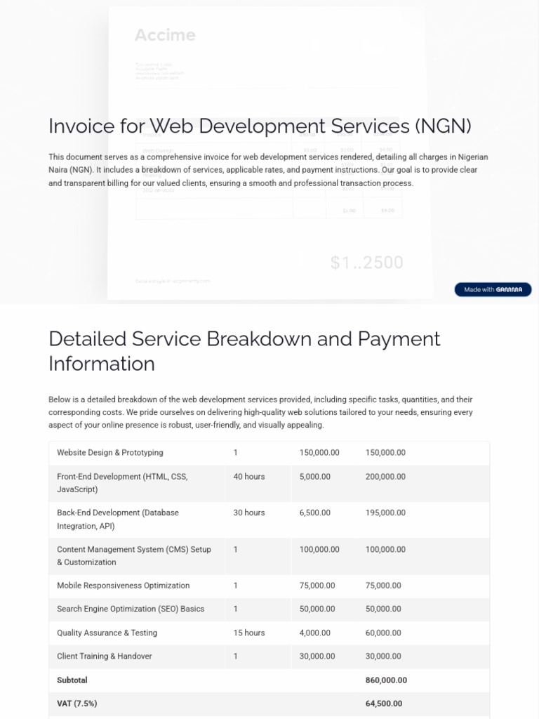 This document serves as a comprehensive invoice for web development services rendered, detailing all charges in Nigerian