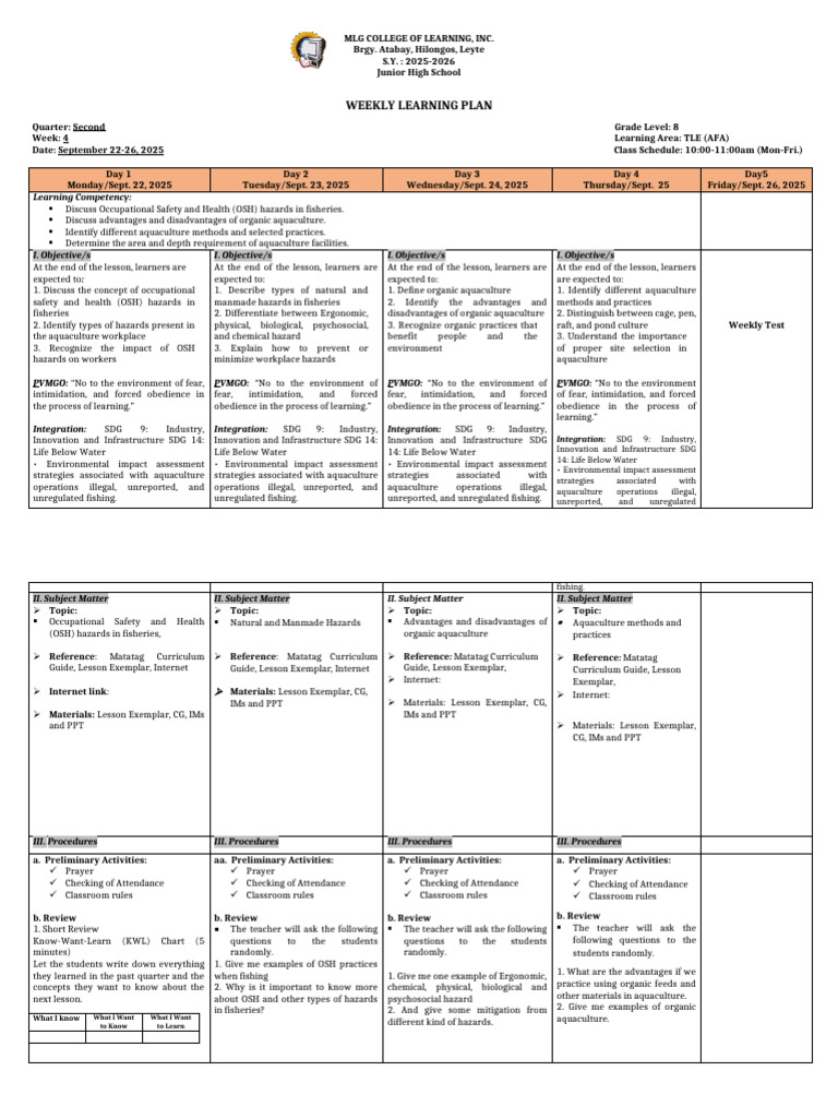 2. Identify types of hazards present in physical, biological, psychosocial, 3. Recognize organic practices that raft, and pond culture Weekly Test
