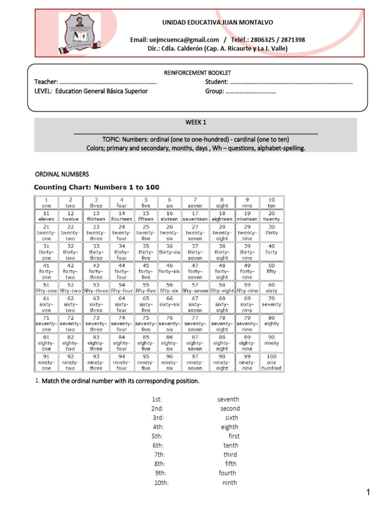 TOPIC: Numbers: ordinal (one to one-hundred) - cardinal (one to ten)