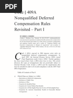 of an additional benet under a new plan adopted March 1 to allow an individual employee to elect a after October 3, 2004 and before January 1, 2005 new change in the time or form of payment without will not be treated as a material modication of an realizing that such a change constituted a material existing plan to the extent that the new plan explicitly modication that would subject the plan to the reidenties additional deferrals of compensation and quirements of Code Sec. 409A, and the modication provides that the additional deferrals of compensation is rescinded on November 1, then the plan is not are subject to Code Sec. 409A. considered materially modied if no change in the A cessation of deferrals under, or termination of, a time or form of payment has been made pursuant to plan, pursuant to the provisions of such plan, is not the modication before November 1. a material modication. Amending a plan to provide II. Definition of Deferred participants an election whether to terminate parCompensation Subject to ticipation in a plan generally constitutes a material modication of the plan. Code Sec. 409A With respect to an account balance plan, it is not A. Establishment of the Service Provider/ a material modication to change a notional investment measure, or to add to an existing investment Service Recipient Relationship measure, to an investment measure that qualies as a predetermined actual investment26 or, for any given Th e Fi n a l R e g s o n l y a p p l y t o c o m p e n s a 27 tory relationships between one that provides tax year, reects a reasonable rate of interest For this the services (a service purpose, if with respect to provider) and one that an amount deferred for a Even though deferred receives such services period, a plan provides for compensation may fall within (a service recipient). a xed rate of interest to be the denition of a deferral of Typically, this relationcredited, and the rate is to be reset under the plan at compensation, there are instances ship will be either a standard employee/ema specied future date that where the deferred compensation ployer relationship or an is not later than the end may be recharacterized and independent contractor of the fth tax year that providing services to an begins after the beginning become completely exempt from individual, a company or of the period, the rate is Code Sec. 409A. easo ab on other entity. reasonable at the beginni g of the period, and ing th eriod and d, ning o t 1. Denition of Service Provider th r e is n c he ge efore the rate s not changed before the reset date, then the ra will be t ated as reasonab in all future periods ate rate will b treated reasonable Final Reg. 1.409A-1(f) provides that the term sere before the reset date. vice p provider includes: tio extension e o a an individual, n The modication, extension or re ewal of a stock renewal f stock an individu corporation, subchapter S corporaright (as dened in II.E.2 below) will not constitute a tion or partnership; material modication of the stock right, if the modia personal service corporation (as dened in cation, extension or renewal would not be treated as Code Sec. 269A(b)(1)), or a noncorporate entity the grant of a new stock right under the Final Regs and that would be a personal service corporation if would not result in the stock right being treated as havit were a corporation; or ing had a deferral feature from the date of grant. a qualied personal service corporation (as deAny modication to the terms of a plan that would ned in Code Sec. 448(d)(2)), or a noncorporate inadvertently result in treatment as a material modientity that would be a qualied personal service cation is not considered a material modication of corporation if it were a corporation; the plan to the extent the modication in the terms for any taxable year in which such individual, of the plan is rescinded by the earlier of a date before corporation, subchapter S corporation, partnerthe right is exercised (if the change grants a discretionship, or other entity accounts for gross income ary right) or the last day of the tax year of the service from the performance of services under the cash provider during which such change occurred. Thus, receipts and disbursements method of accountif a service recipient modies the terms of a plan on ing. The term service provider also includes a