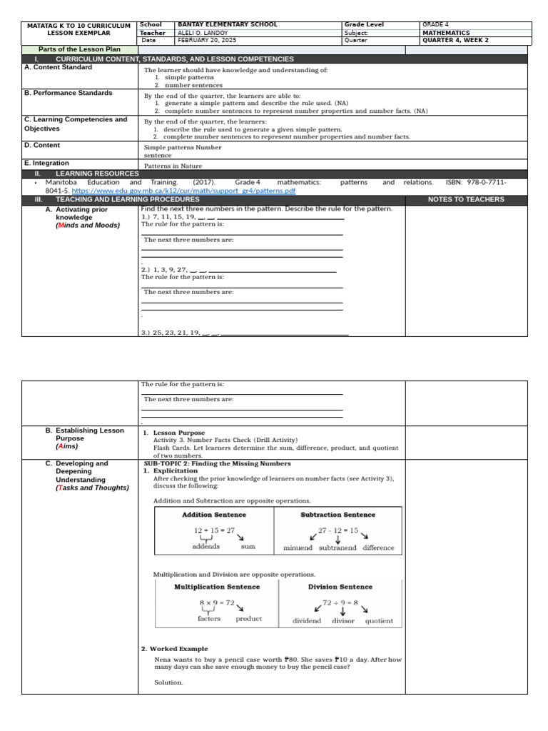 LESSON EXEMPLAR Teacher ALELI O. LANDOY Subject: MATHEMATICS