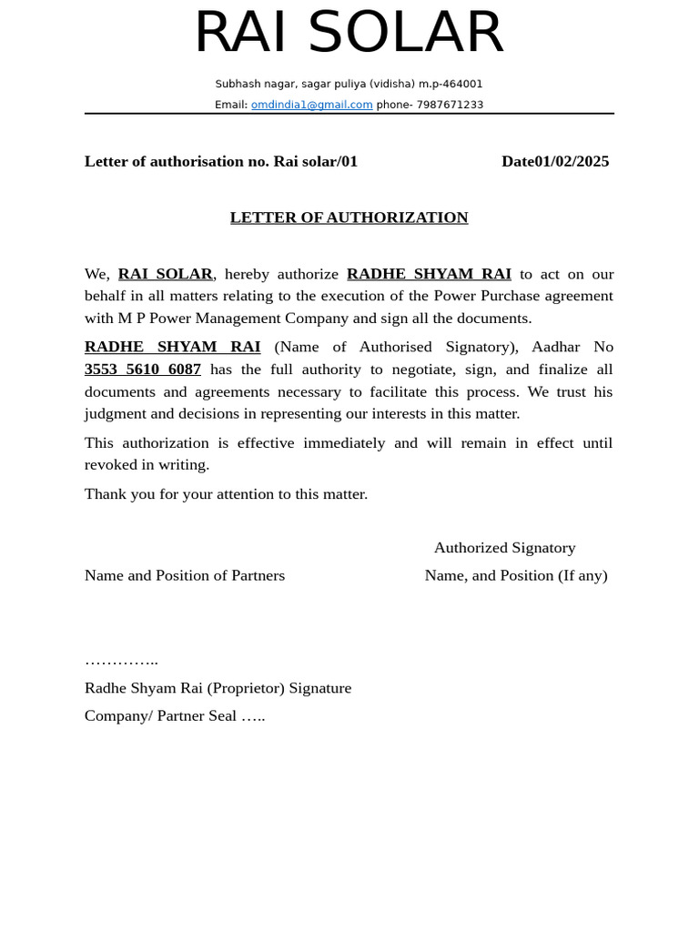 Letter of authorisation no. Rai solar/01 Date01/02/2025