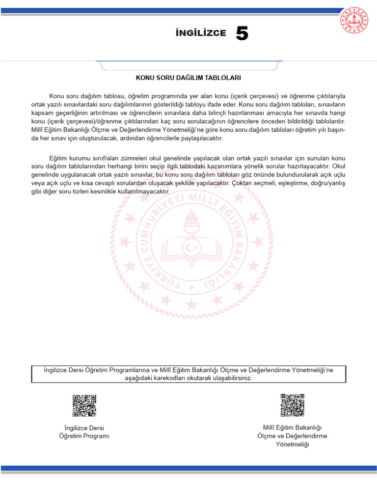 Millî Eğitim Bakanlığı Ölçme ve Değerlendirme Yönetmeliği’ne göre konu soru dağılım tabloları öğretim yılı başın-