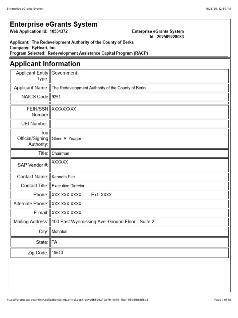 Applicant Name: The Redevelopment Authority of the County of Berks