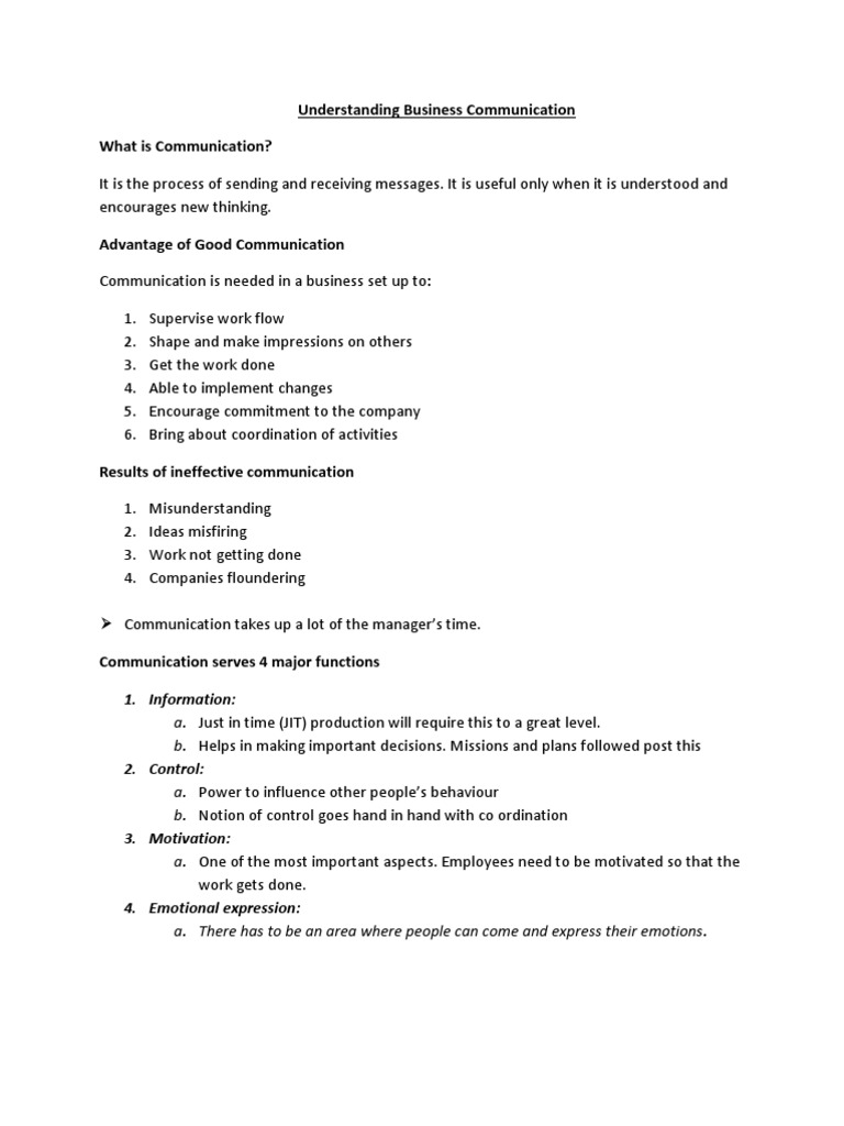 Communication takes up a lot of the managers time. Communication serves 4 major functions 1. Information: a. Just in time (JIT) production will require this to a great level. b. Helps in making important decisions. Missions and plans followed post this 2. Control: a. Power to influence other peoples behaviour b. Notion of control goes hand in hand with co ordination 3. Motivation: a. One of the most important aspects. Employees need to be motivated so that the work gets done. 4. Emotional expression: a. There has to be an area where people can come and express their emotions.
