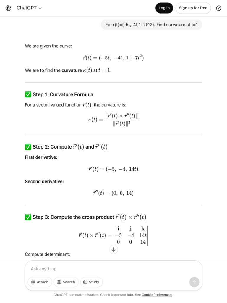 For r(t)=(-5t,-4t,1+7t^2). Find curvature at t=1