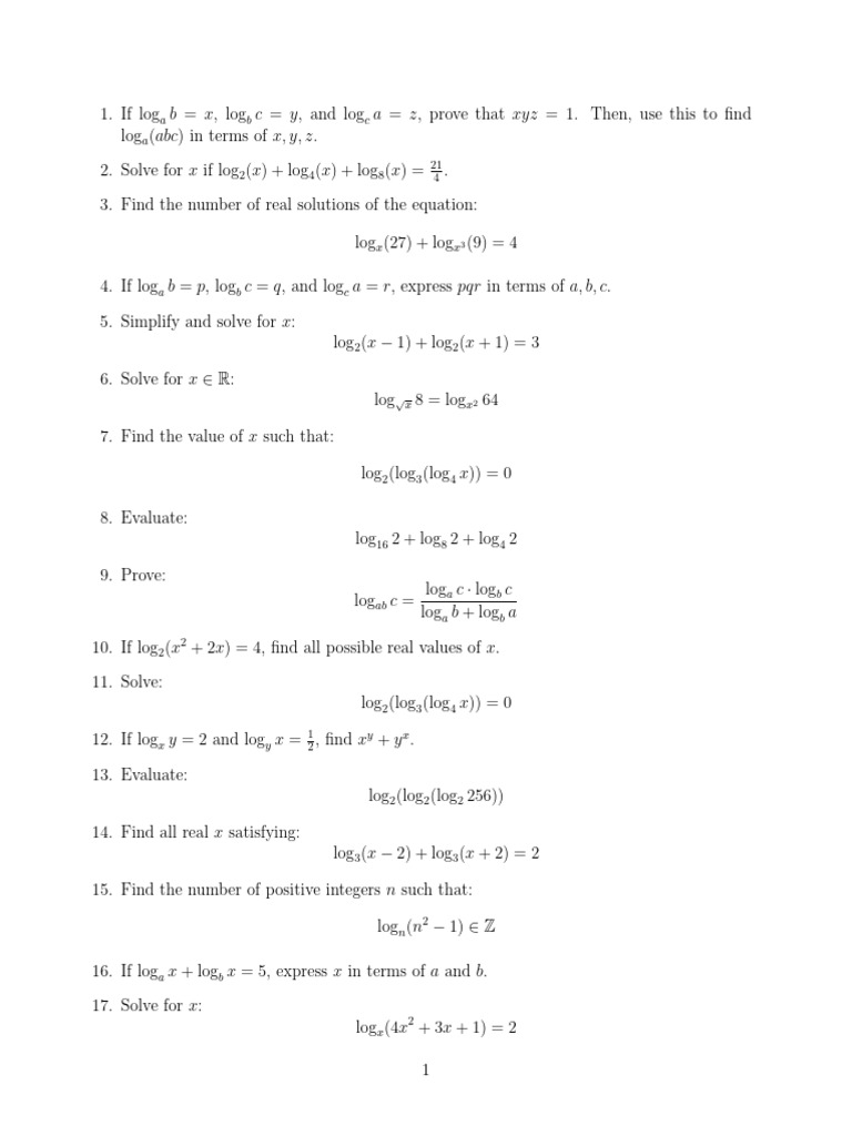 1. If loga b = x, logb c = y, and logc a = z, prove that xyz = 1.