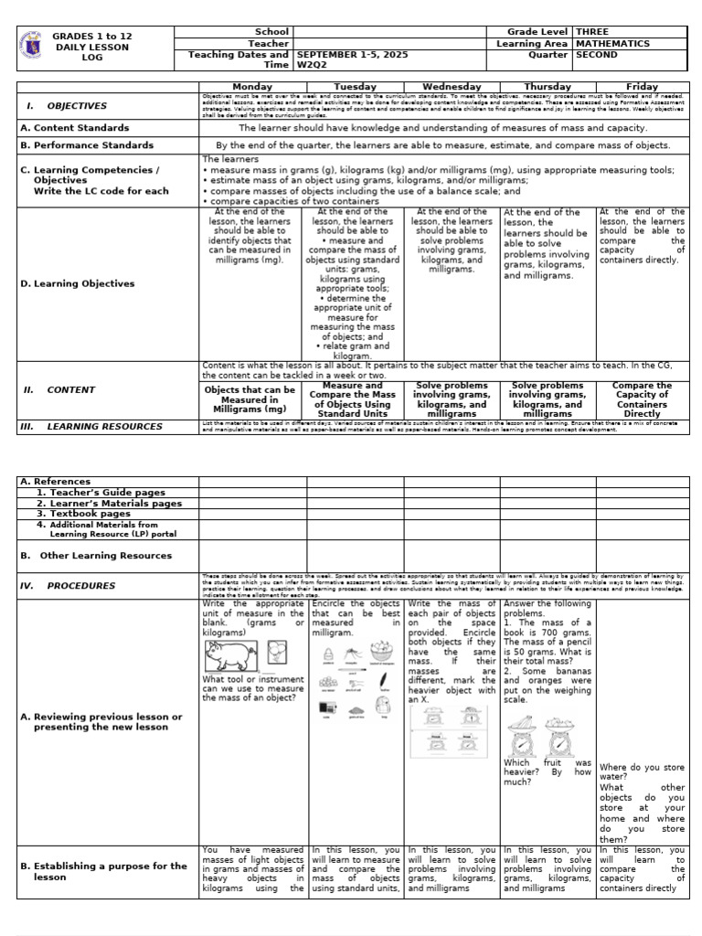 C. Learning Competencies / • measure mass in grams (g), kilograms (kg) and/or milligrams (mg), using appropriate measuring tools;