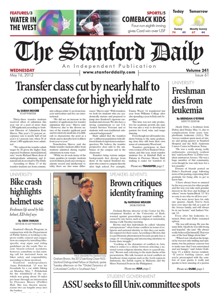 Akash Dube, a freshman from Dubai, died Friday, May 11, due to complications from acute lymphoblastic leukemia (ALL). The Arroyo resident spent most of winter and spring quarter in Stanford Hospital and the M.D. Anderson Cancer Center in Houston, Texas. He was a really strong, really enthusiastic, extremely resilient kid, said Lena Potts 12, Dubes resident assistant in Arroyo. He was a huge member of this community, even though he was only here for a few months. Dozens of friends posted on Dubes Facebook page following news of his passing, expressing their gratitude for being able to get to know him. I have always been so amazed by the way you care for other people and the way you take such genuine interest in the lives and feelings of others, wrote Austin Block 15.Its so easy to see why we all love you. You were never here for only one quarter, Akash. Youve been here ever since the fall, as a part of the Arroyo family, and will always be in our hearts, said Janhavi Vartak 15. Even after his leukemia returned, Potts said Dube remained upbeat. He was still strong. He was the same little Akash; he was still strong and hopeful, she said. He always really believed [in himself].That was one of the best things about him. When I saw Akash in the hospital he was not only smiling and optimistic, but his primary concern was to make sure that I was entertained and not hungry, said Adam Goldberg 15, a fellow Arroyo resident. If youre battling cancer, and youre preoccupied with the comfort of your guests, it really just speaks to how amazing of a person