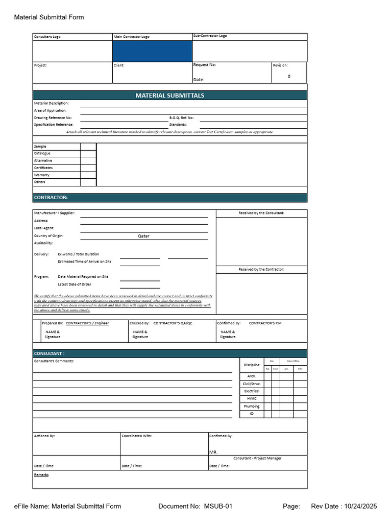 eFile Name: Material Submittal Form Document No: MSUB-01 Page: Rev Date : 10/24/2025