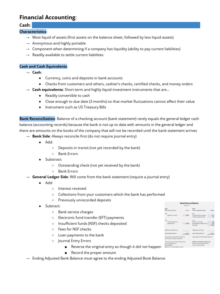 Bank Reconciliation: Balance of a checking account (bank statement) rarely equals the general ledger cash
