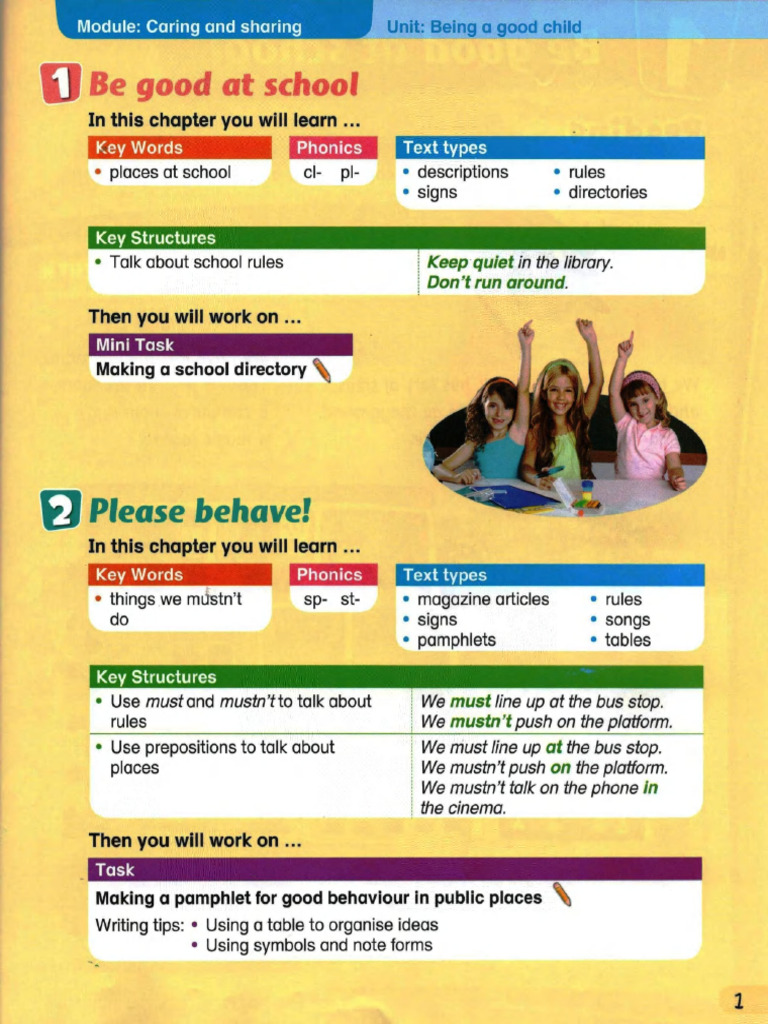 The document outlines educational content focused on school rules and good behavior in various public places. It includes activities for students to learn about phonics, text types, and how to express rules using 'must' and 'mustn't'. Additionally, it features examples of directories and pamphlets to reinforce the importance of following rules in different settings.