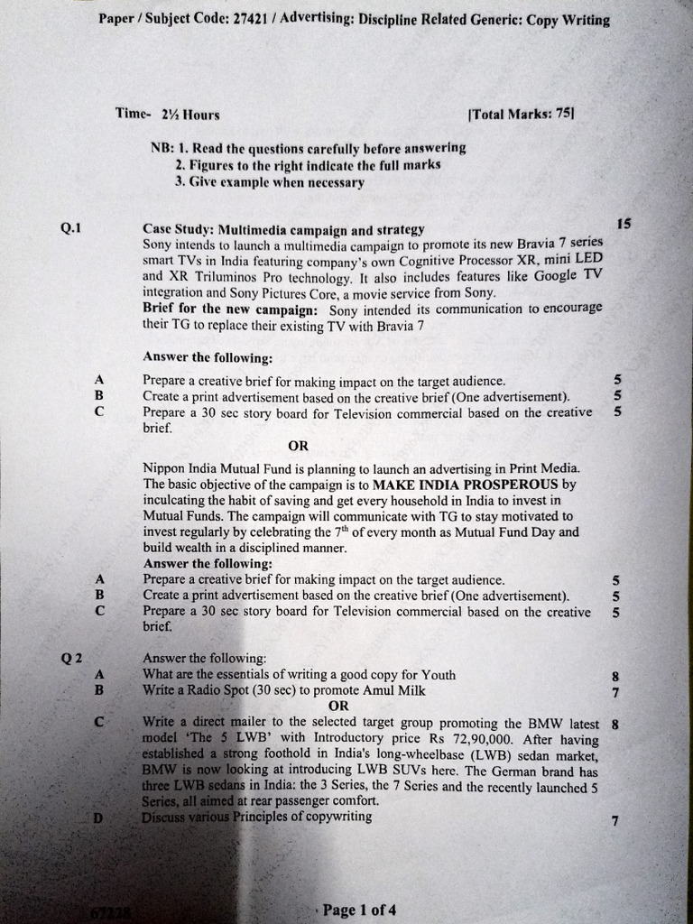 Paper / Subject Code: 27421 / Advertising: Discipline Related Generie: Copy Writing