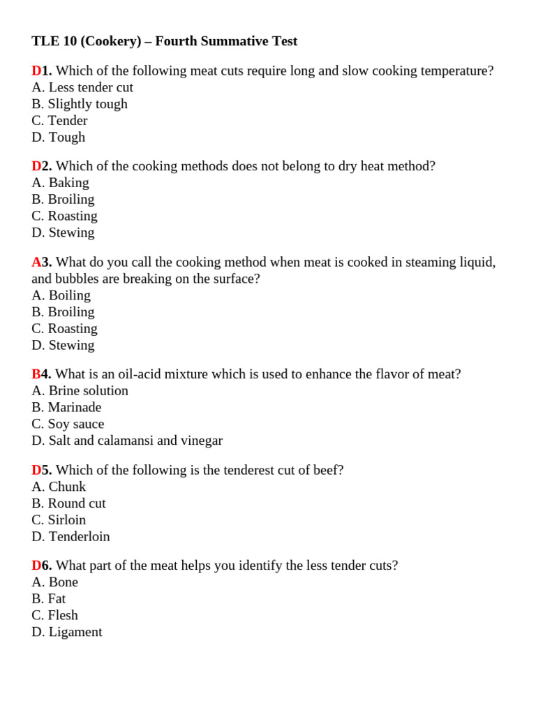 TLE 10 (Cookery) – Fourth Summative Test