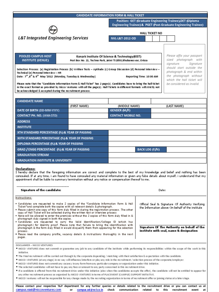 Instructions: Candidates are requested to make 2 copies of the Candidate Information Form & Hall Ticket and complete both the copies with all relevant details & photograph. Please submit one copy of this form duly filled in during the registration process. The other copy of Hall Ticket will be collected during the written test or interview process None will be allowed to enter the premises without the 2 copies of this form duly filled in & photograph duly signed in both the copies. Candidates are requested to carry the Valid Identification/College ID (which has photograph) for Identity proof. Please note that failure to bring the identification with photograph & the form duly filled in would disqualify them from appearing for the selection process. Please read the company profile, vacancy details & instructions thoroughly in the next pages.