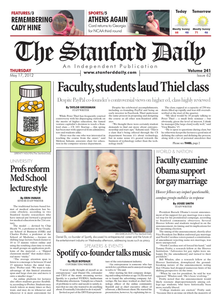 for yourself to go and tell a 67-yearold man who barely agreed to sell the music on iTunes for 99 cents apiece to now give it away for free. The numbers have proved Ek right. While the average American spends $13 a year on music, the premium Spotify user pays $120. This allows us to compensate the right-holders the way they should be for the great job they are doing, Ek said. Responding to a question from the audience on whether Spotify might save the music industry, Ek said that the move away from physically purchasing music has created a need for innovation in the sector. Sweden, the first country where Spotify was implemented, is now one of the few countries that have a growing music industry, he pointed out. Ek also discussed the future of piracy, which he acknowledged as Spotifys biggest competitor. Most people want convenience and easy access [to music], Ek said. With Spotify, people can feel that they have all the worlds music in their music library. He argued, however, that unless the television and movie industries work actively to solve the same problems the music industry is facing, illegal downloading will persist. I cannot accept that it takes a year for a great TV show like Game of Thrones to be seen in Europe, Ek said. I want content to be readily available, and if I am willing to pay for it, why not? Ek concluded his talk by encouraging audience members to fix the issue, and pursue non-piracy solutions to the problem. Contact Felix Boyeaux at fboyeaux @stanford.edu. takeaway has been exactly what Ive expected, which is kind of a crash course in how the Valley works . . . kind of comprehensively addressing how to make a company here and how to make it successful. Sahami stated that, while faculty had been well aware of Thiels thoughts on higher education prior to approving the course, they saw no conflict between Thiels opinions and the courses prospects. Even though Peter may have some outspoken views about the value of higher education, in some sense we think it provides more information for students to make their own choices, Sahami said. Thats what education is supposed to be about. Contact Taylor Grossman at taylormg@stanford.edu.