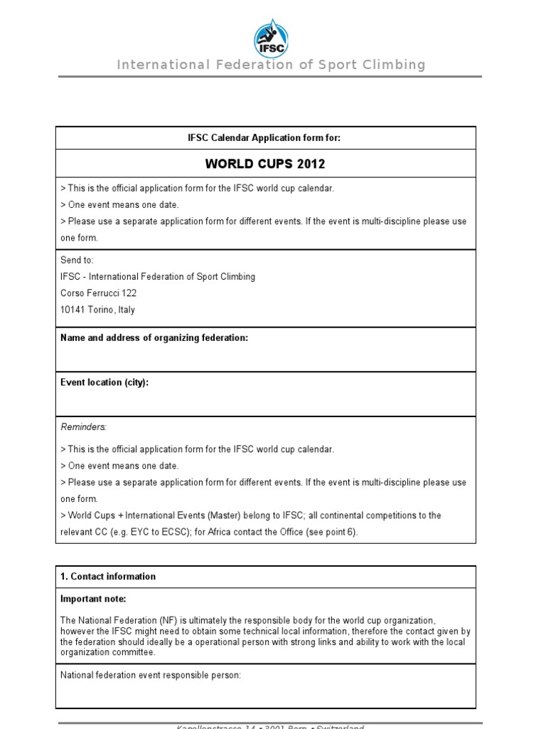 > This is the official application form for the IFSC world cup calendar. > One event means one date. > Please use a separate application form for different events. If the event is multi-discipline please use one form. Send to: IFSC - International Federation of Sport Climbing Corso Ferrucci 122 10141 Torino, Italy Name and address of organizing federation: Event location (city): Reminders: > This is the official application form for the IFSC world cup calendar. > One event means one date. > Please use a separate application form for different events. If the event is multi-discipline please use one form. > World Cups + International Events (Master) belong to IFSC; all continental competitions to the relevant CC (e.g. EYC to ECSC); for Africa contact the Office (see point 6).