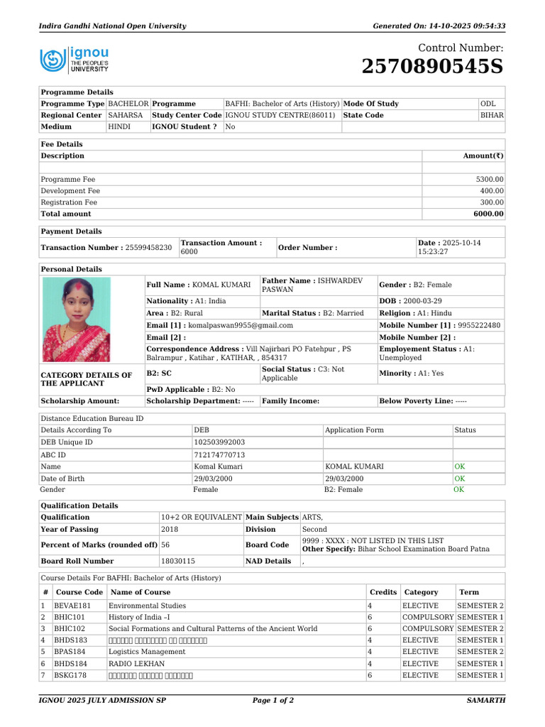 Full Name : KOMAL KUMARI Gender : B2: Female