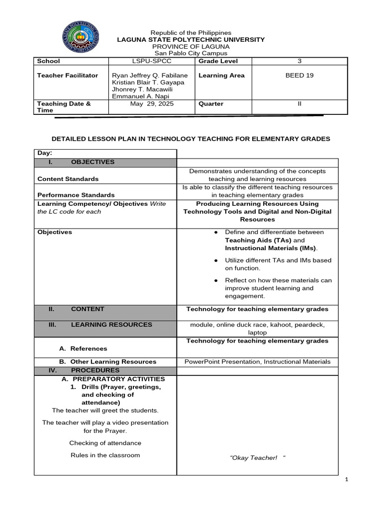 DETAILED LESSON PLAN IN TECHNOLOGY TEACHING FOR ELEMENTARY GRADES