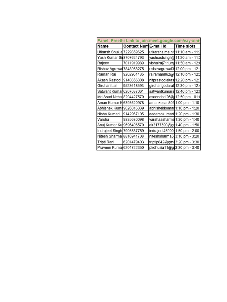 Name Contact Number E-mail Id Time slots