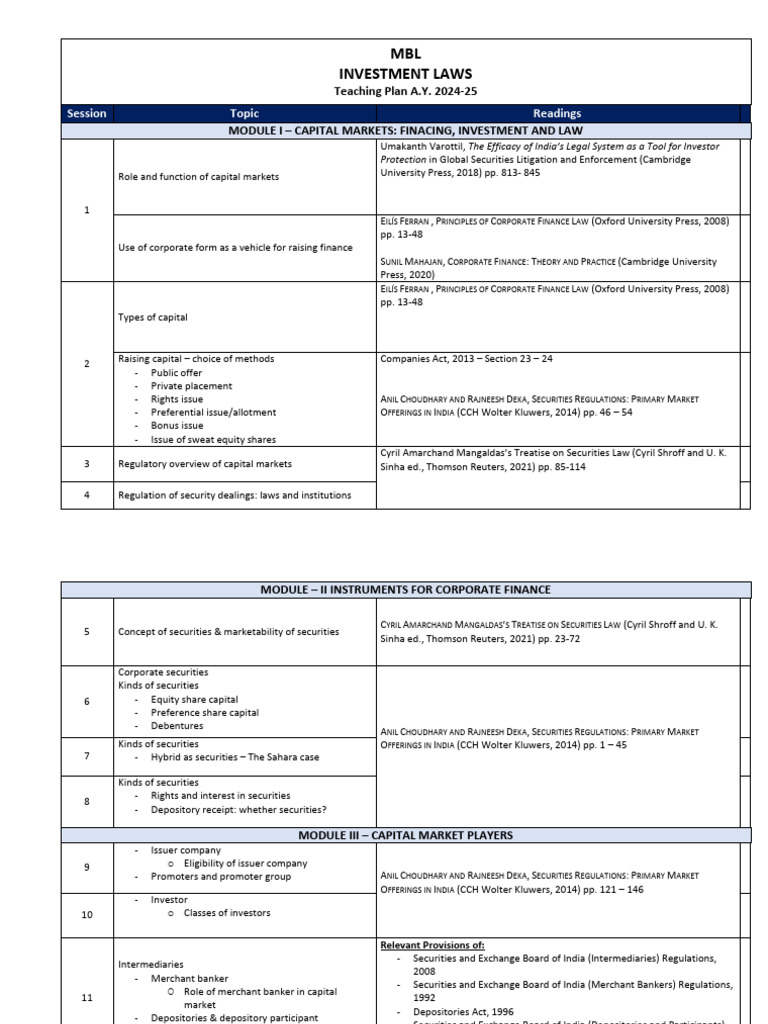MODULE I – CAPITAL MARKETS: FINACING, INVESTMENT AND LAW
