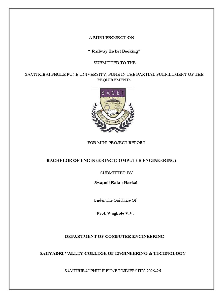 Report work on “Railway Ticket Booking ” at Sahyadri Valley College Of Engineering and