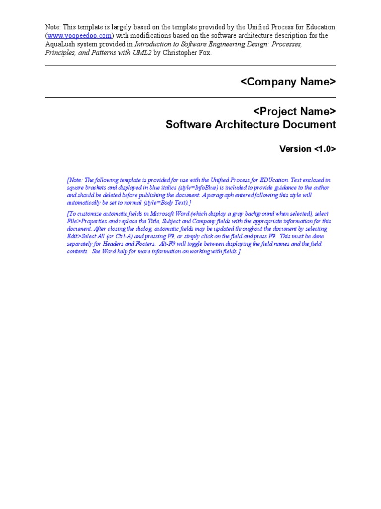 [Note: The following template is provided for use with the Unified Process for EDUcation. Text enclosed in square brackets and displayed in blue italics (style=InfoBlue) is included to provide guidance to the author and should be deleted before publishing the document. A paragraph entered following this style will automatically be set to normal (style=Body Text).] [To customize automatic fields in Microsoft Word (which display a gray background when selected), select File>Properties and replace the Title, Subject and Company fields with the appropriate information for this document. After closing the dialog, automatic fields may be updated throughout the document by selecting Edit>Select All (or Ctrl-A) and pressing F9, or simply click on the field and press F9. This must be done separately for Headers and Footers. Alt-F9 will toggle between displaying the field names and the field contents. See Word help for more information on working with fields.]