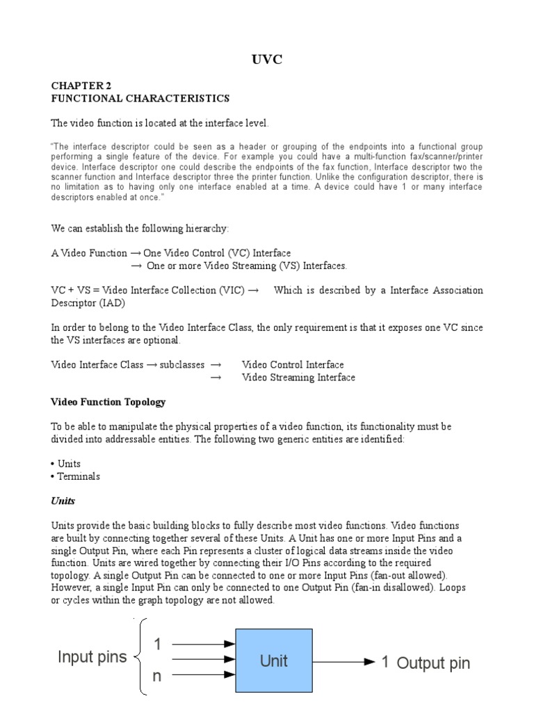In order to belong to the Video Interface Class, the only requirement is that it exposes one VC since the VS interfaces are optional. Video Interface Class subclasses Video Function Topology To be able to manipulate the physical properties of a video function, its functionality must be divided into addressable entities. The following two generic entities are identified: Units Terminals Units Units provide the basic building blocks to fully describe most video functions. Video functions are built by connecting together several of these Units. A Unit has one or more Input Pins and a single Output Pin, where each Pin represents a cluster of logical data streams inside the video function. Units are wired together by connecting their I/O Pins according to the required topology. A single Output Pin can be connected to one or more Input Pins (fan-out allowed). However, a single Input Pin can only be connected to one Output Pin (fan-in disallowed). Loops or cycles within the graph topology are not allowed. Video Control Interface Video Streaming Interface