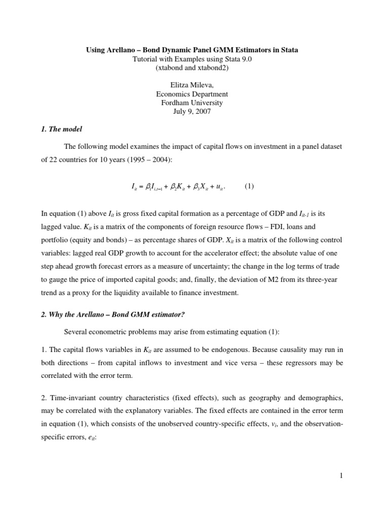 .0 (xtabond and xtabond2) Elitza Mileva, Economics Department Fordham University July 9, 2007 1. The model The following model examines the impact of capital flows on investment in a panel dataset of 22 countries for 10 years (1995 2004): Iit = 1Ii,t1 + 2K it + 3 X it + uit .