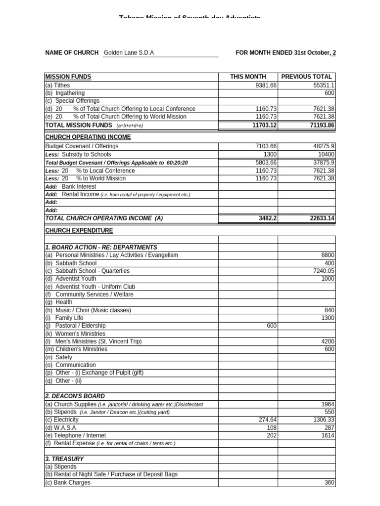 NAME OF CHURCH Golden Lane S.D.A FOR MONTH ENDED 31st October, 2025