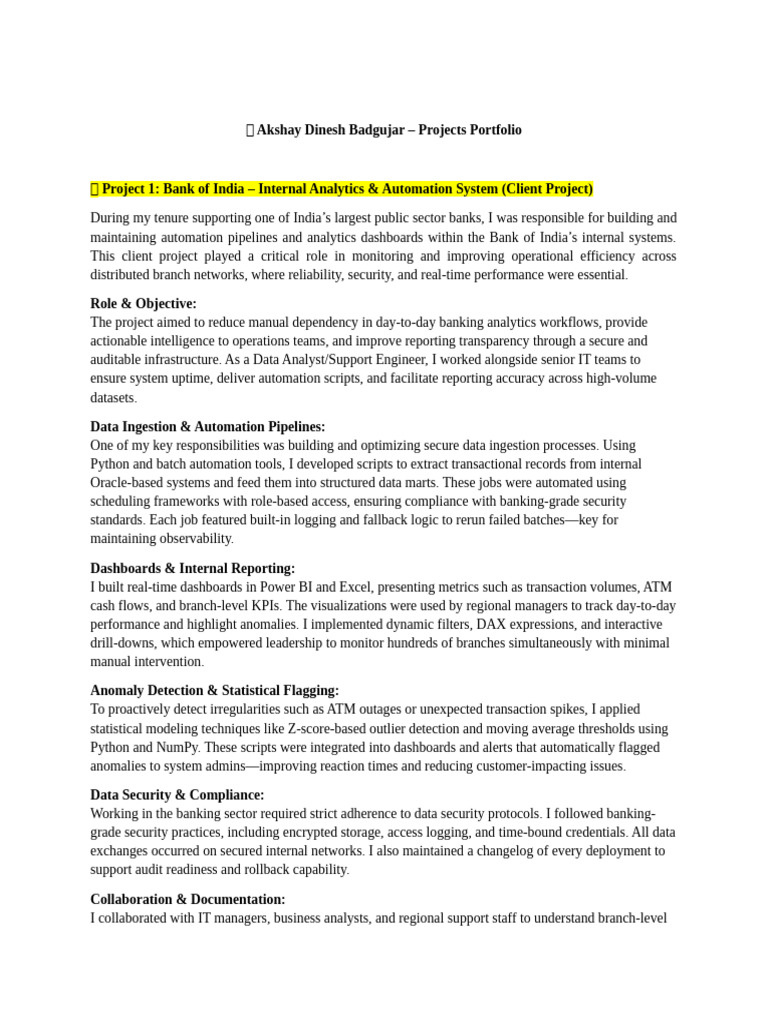 maintaining automation pipelines and analytics dashboards within the Bank of India’s internal systems.