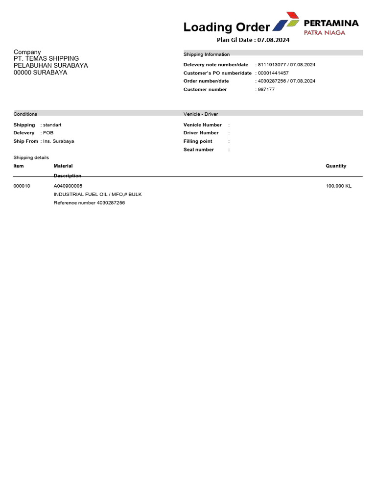 PELABUHAN SURABAYA Delevery note number/date : 8111913077 / 07.08.2024
