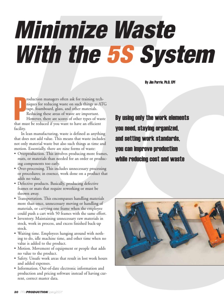 By Jim Parrie, Ph.D, CPF roduction managers often ask for training techniques for reducing waste on such things as ATG tape, foamboard, glass, and other materials. Reducing these areas of waste are important. However, there are scores of other types of waste that must be reduced if you want to have an efficient facility. In lean manufacturing, waste is defined as anything that does not add value. This means that waste includes not only material waste but also such things as time and motion. Essentially, there are nine forms of waste: Overproduction. This involves producing more frames, mats, or materials than needed for an order or producing components too early. Over-processing. This includes unnecessary processing or procedures; in essence, work done on a product that adds no value. Defective products. Basically, producing defective frames or mats that require reworking or must be thrown away. Transportation. This encompasses handling materials more than once, unnecessary moving or handling of materials, or carrying one frame when the employee could push a cart with 50 frames with the same effort. Inventory. Maintaining unnecessary raw materials in stock, work in process, and excess finished back-up stock. Waiting time. Employees hanging around with nothing to do, idle machine time, and other time when no value is added to the product. Motion. Movement of equipment or people that adds no value to the product. Safety. Unsafe work areas that result in lost work hours and added expenses. Information. Out-of-date electronic information and production and pricing software instead of having current, correct master data.