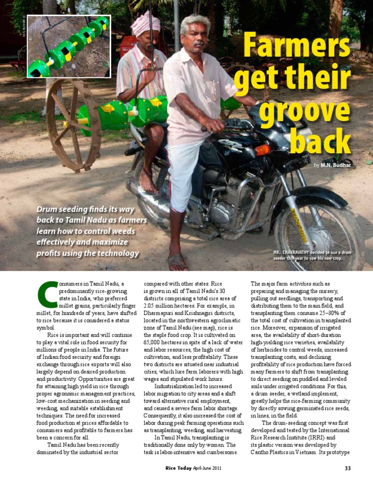 Vol. 1, No. 2). Farmers in Tamil Nadu have also accepted the drum-seeding technology because it cuts labor and seed costs, speeds up the planting process, provides higher yields, or at least yields similar to those of transplanted rice, and is easy to operate.