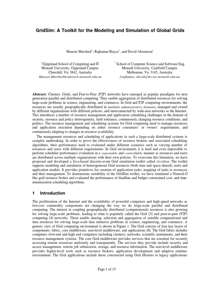 R. Buyya, J. Giddy, D. Abramson, An Evaluation of Economy-based Resource Trading and Scheduling on Computational Power Grids for Parameter Sweep Applications, The Second Workshop on Active Middleware Services (AMS 2000), In conjunction with HPDC 2001, August 1, 2000, Pittsburgh, USA (Kluwer Academic Press). R. Buyya, H. Stockinger, J. Giddy, and D. Abramson, Economic Models for Management of Resources in Peer-to-Peer and Grid Computing, SPIE International Conference on Commercial Applications for High-Performance Computing, August 20-24, 2001, Denver, USA. I. Foster and C. Kesselman, Globus: A Metacomputing Infrastructure Toolkit, International Journal of Supercomputer Applications, 11(2): 115-128, 1997. J. Weissman, Grids in the Classroom, IEEE Distributed Systems Online, Volume 1, No. 3, 2000, [Link] CACI, Simscript: a simulation language for building large-scale, complex simulation models, CACI Products Company, San Diego, CA, USA, [Link] R. Bagrodia, R. Meyer, M. Takai, Y. Chen, X. Zeng, J. Martin, B. Park, H. Song, Parsec: A Parallel Simulation Environment for Complex Systems, Vol. 31(10), IEEE Computer, October 1998. K. Aida, A. Takefusa, H. Nakada, S. Matsuoka, S. Sekiguchi, and U. Nagashima, Performance evaluation model for scheduling in a global computing system, The International Journal of High Performance Computing Applications, vol. 14, No. 3, 2000. H. Casanova, Simgrid: A Toolkit for the Simulation of Application Scheduling, Proceedings of the First IEEE/ACM International Symposium on Cluster Computing and the Grid (CCGrid 2001), May 15-18, 2001, Brisbane, Australia. H. Song, X. Liu, D. Jakobsen, R. Bhagwan, X. Zhang, K. Taura and A. Chien, The MicroGrid: a Scientific Tool for Modeling Computational Grids, Proceedings of IEEE Supercomputing (SC 2000), Nov. 4-10, 2000, Dallas, USA. A. Varga, The OMNeT++ Discrete Event Simulation System, Proceedings of the European Simulation Multiconference (ESM'2001). June 6-9, 2001. Prague, Czech Republic. R. Buyya, The World Wide Grid, [Link] Foundation for Intelligent Physical Agents (FIPA), Interaction and Negotiation Protocols, [Link]