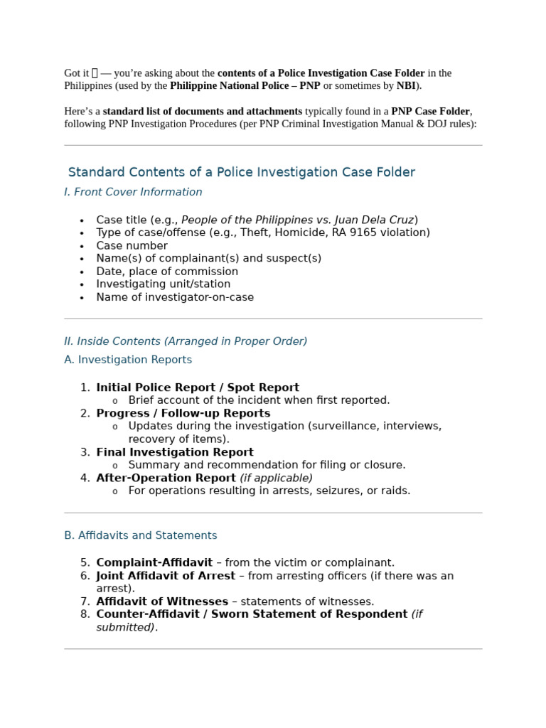 Here’s a standard list of documents and attachments typically found in a PNP Case Folder,