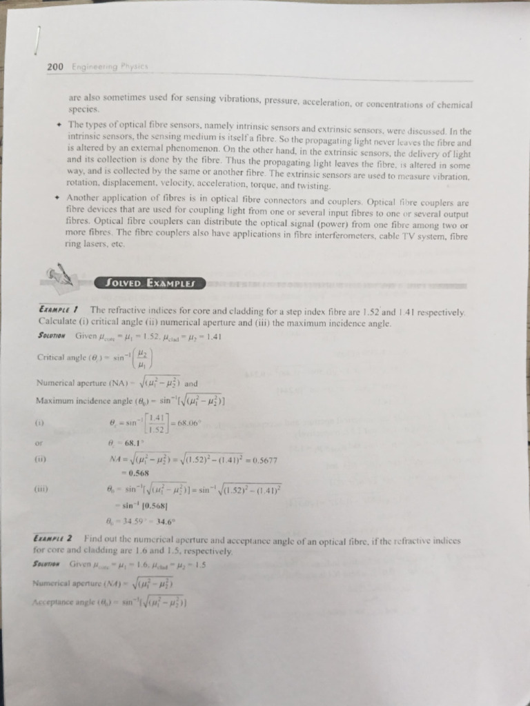 ExAMPLE 1 The refractive indices for core and cladding fora step index fibre are 1.52 and 1.41 respectively.