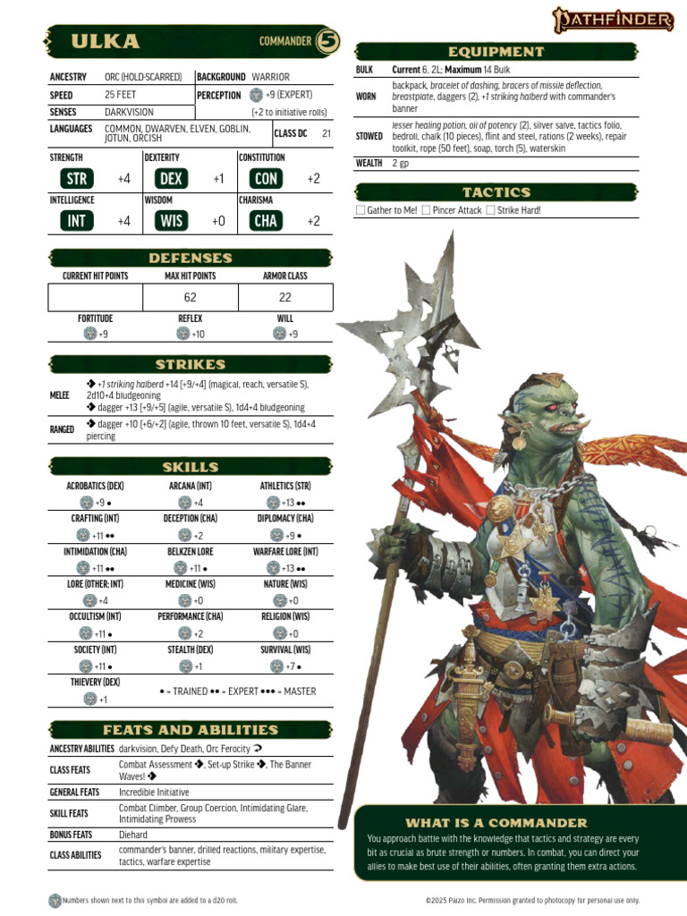 SPEED 25 FEET PERCEPTION +9 (EXPERT) WORN breastplate, daggers (2), +1 striking halberd with commander’s