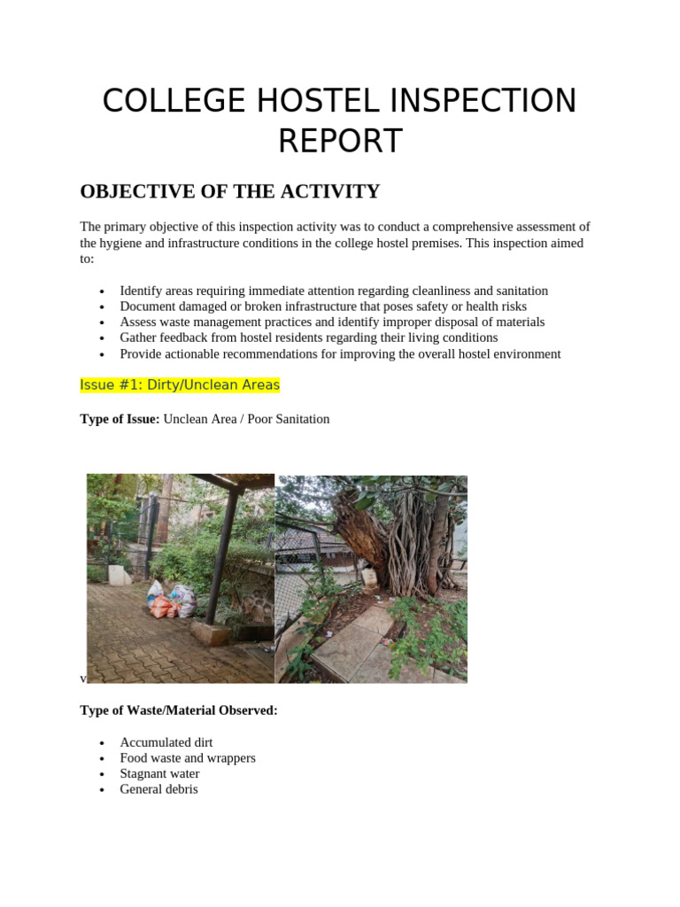 the hygiene and infrastructure conditions in the college hostel premises. This inspection aimed