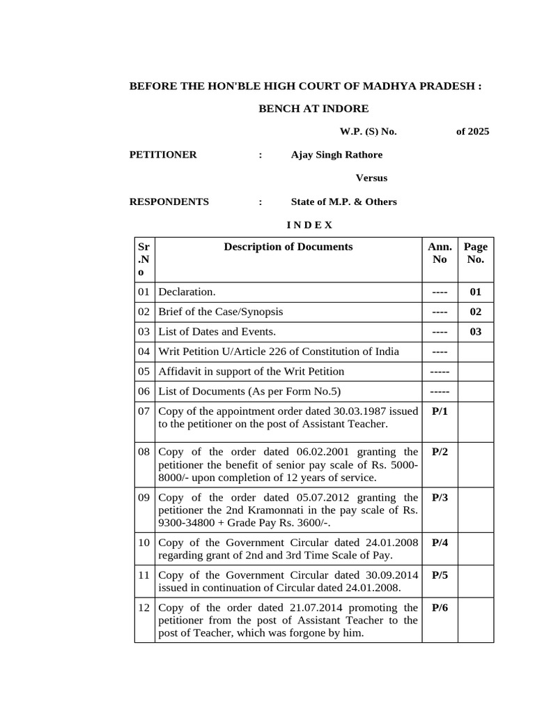 BEFORE THE HON'BLE HIGH COURT OF MADHYA PRADESH :